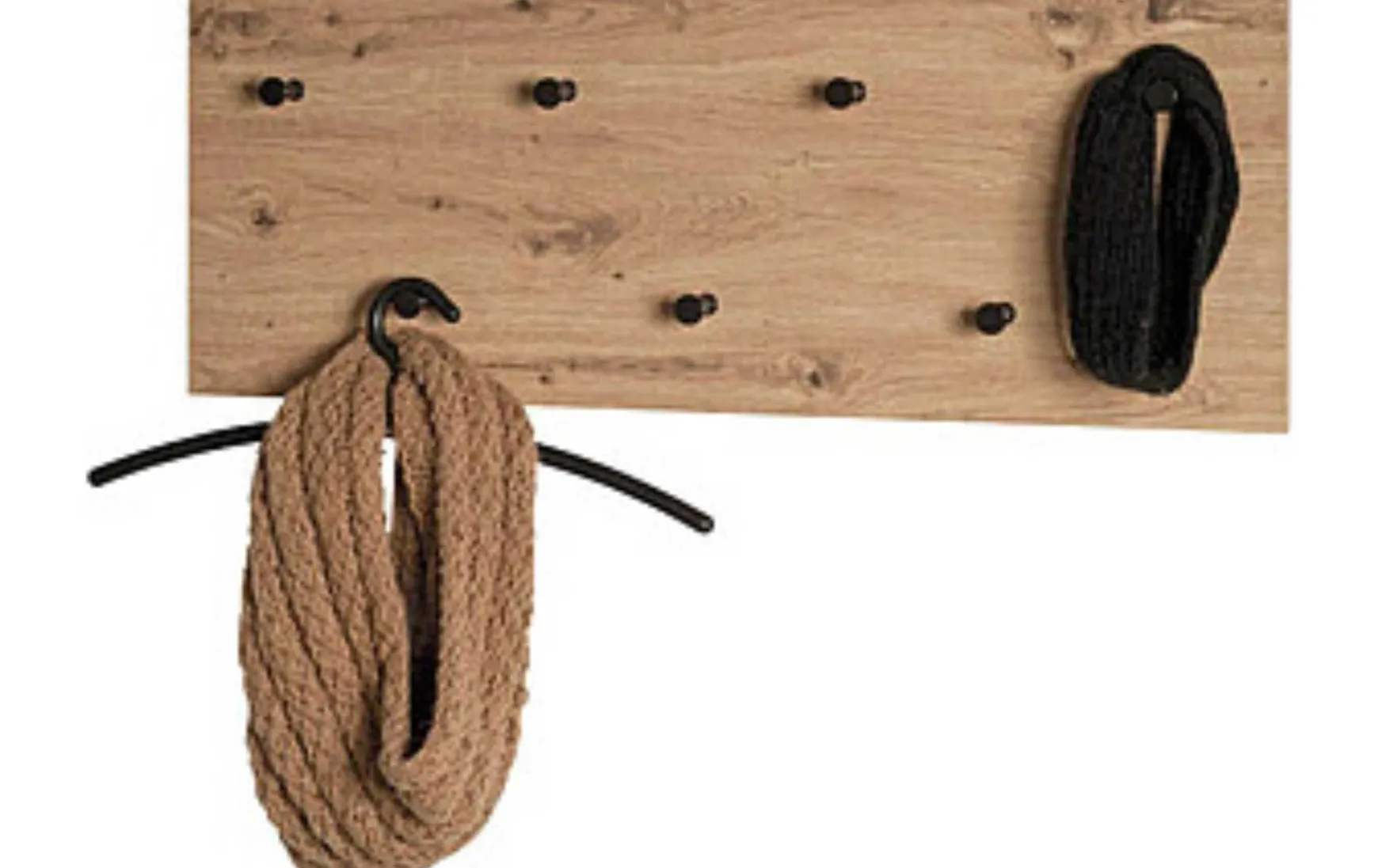 Diese Wandgarderobe ist so flexibel wie Sie! Man kann sie längs oder quer aufhängen, sie als klassische Garderobe im Eingangsbereich verwenden oder einfach in jedem Zimmer als zusätzliche Ablagemöglichkeit. Man möchte gar nicht meinen, was man alles an einem Haken aufhängen kann. Die Wandgarderobe ist aus MDF-Dekor eiche, die Garderobenhaken sind aus Metall in schwarz lackiert.