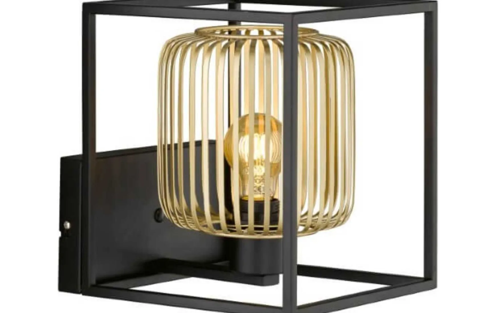 Bei dieser Wandleuchte steht der goldfarbige Lampenschirme im schönen Kontrast zum sandschwarzen Metallrahmen und erzeugt spannende Licht- und Schatteneffekte.