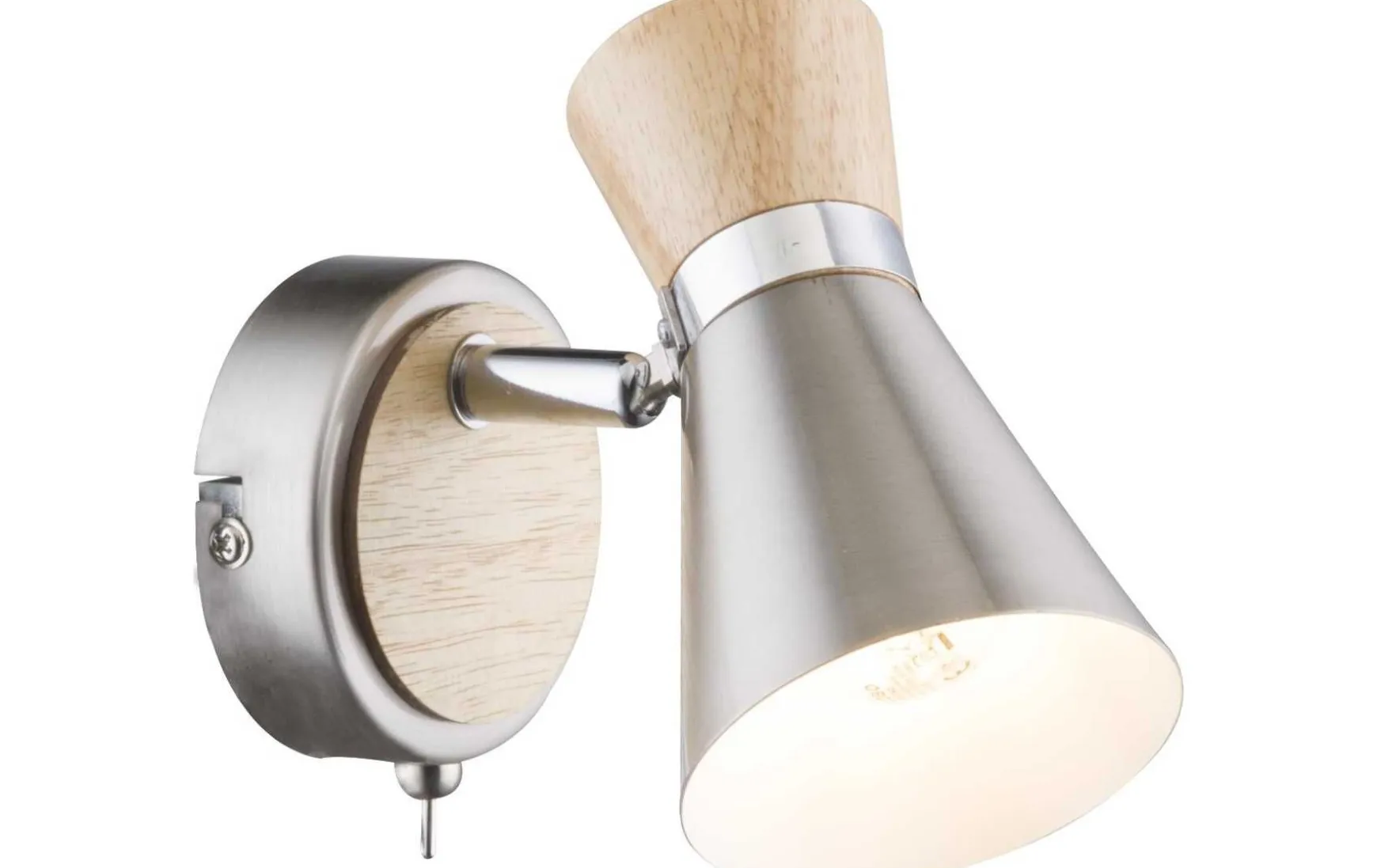 Dieser Wandstrahler überzeugt durch die Kombination aus Design und Verarbeitung. Die Materialkombination aus Holz, nickelmatten sowie verchromten Metall sorgt für eine tolle Optik.