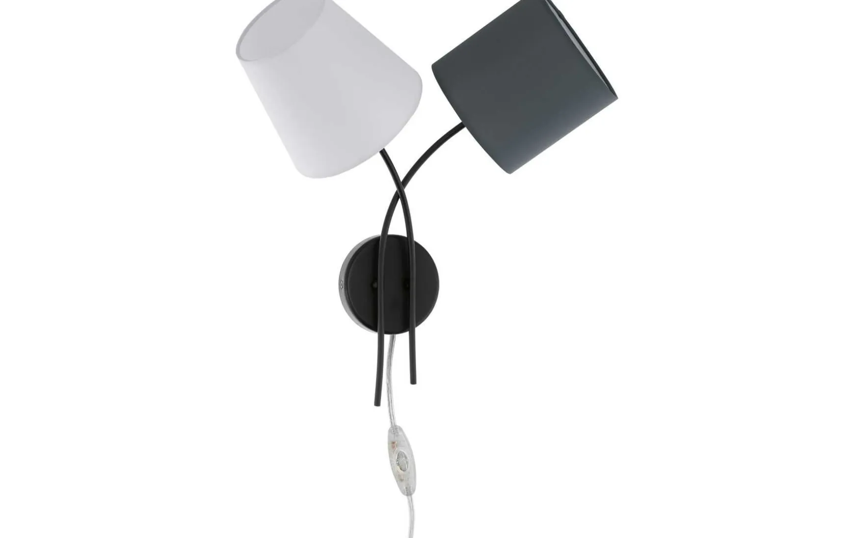 Die Wandleuchte ist mit einer runden Metall-Basis in Schwarz gefertigt, an der eine gleichfarbige geschwungene Metall-Halterung mit zwei Textilschirmen angebracht wurde. Die zwei Schirme sorgen mit unterschiedlichen Farben in Anthrazit und Weiß für einen reizvollen und zugleich harmonischen Look. Dieser wird durch die verschiedenen Lampenschirm-Formen unterstützt. Die Wandlampe fügt sich nahtlos in moderne Einrichtungsstile ein und bietet eine wohnliche Beleuchtung im Wohnzimmer, Schlafzimmer, Esszimmer oder Flur. Die Leuchtmittel sind nicht im Lieferumfang enthalten. Geeignet ist die Leuchte für jedes Leuchtmittel mit E14-Sockel.