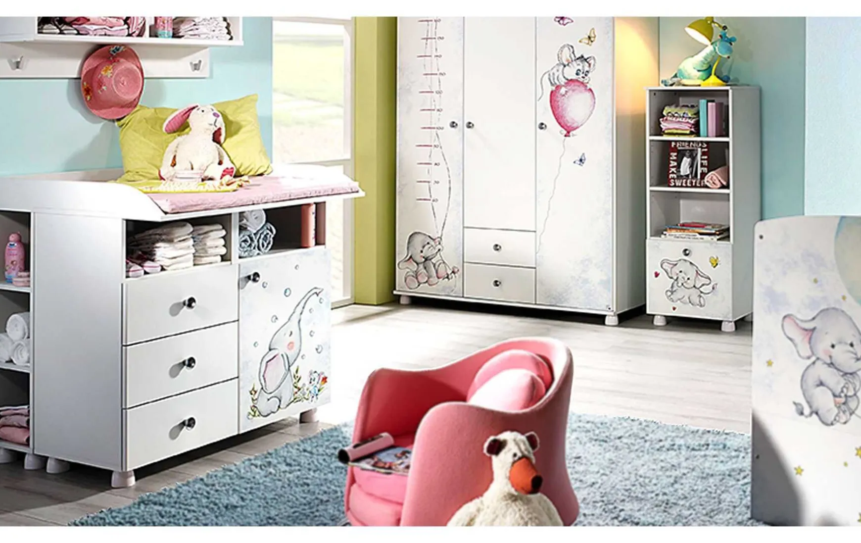 - Nicht im Preis enthalten: Drehtürschrank, Regale, Kommode, Bett. Dekoartikel sind im Lieferumfang nicht enthalten.
