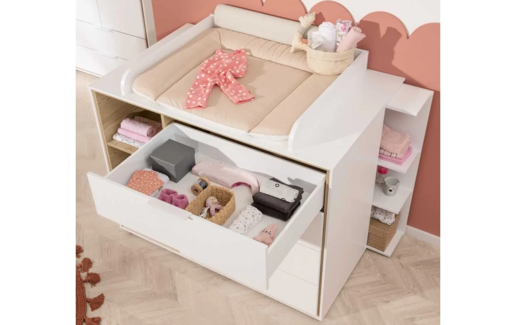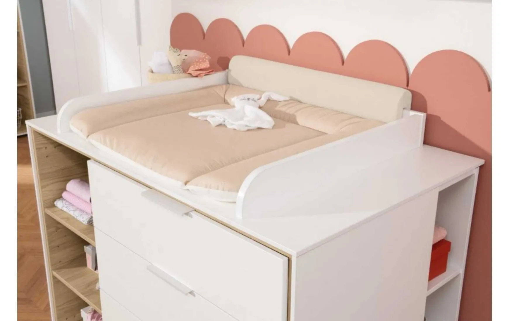Mit dem sicheren, extra hohen Wickelaufsatz wickeln Eltern ihr Baby sicher. Wenn die Zeit des Wickelns vorbei ist, wird die Kommode mit einer zweiten Deckplatte zum Statement Piece für den Nachwuchs. So kann sie Kommode Ihnen und Ihrem Kind über einen langen Zeitraum Freude bereiten.