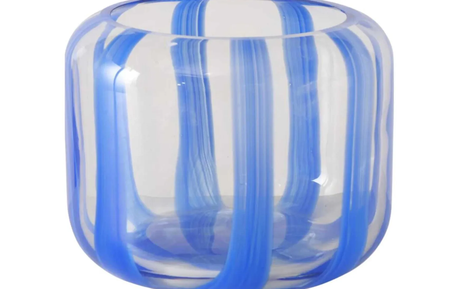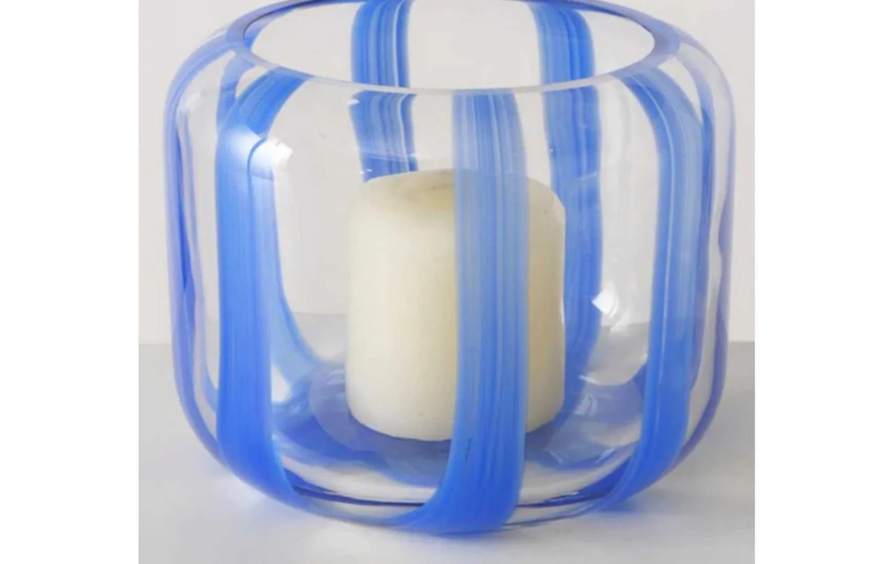 Dekoratives Windlicht aus Glas mit blauen Streifen in ansprechendem Design, das für unterschiedliche Dekozwecke genutzt werden kann.