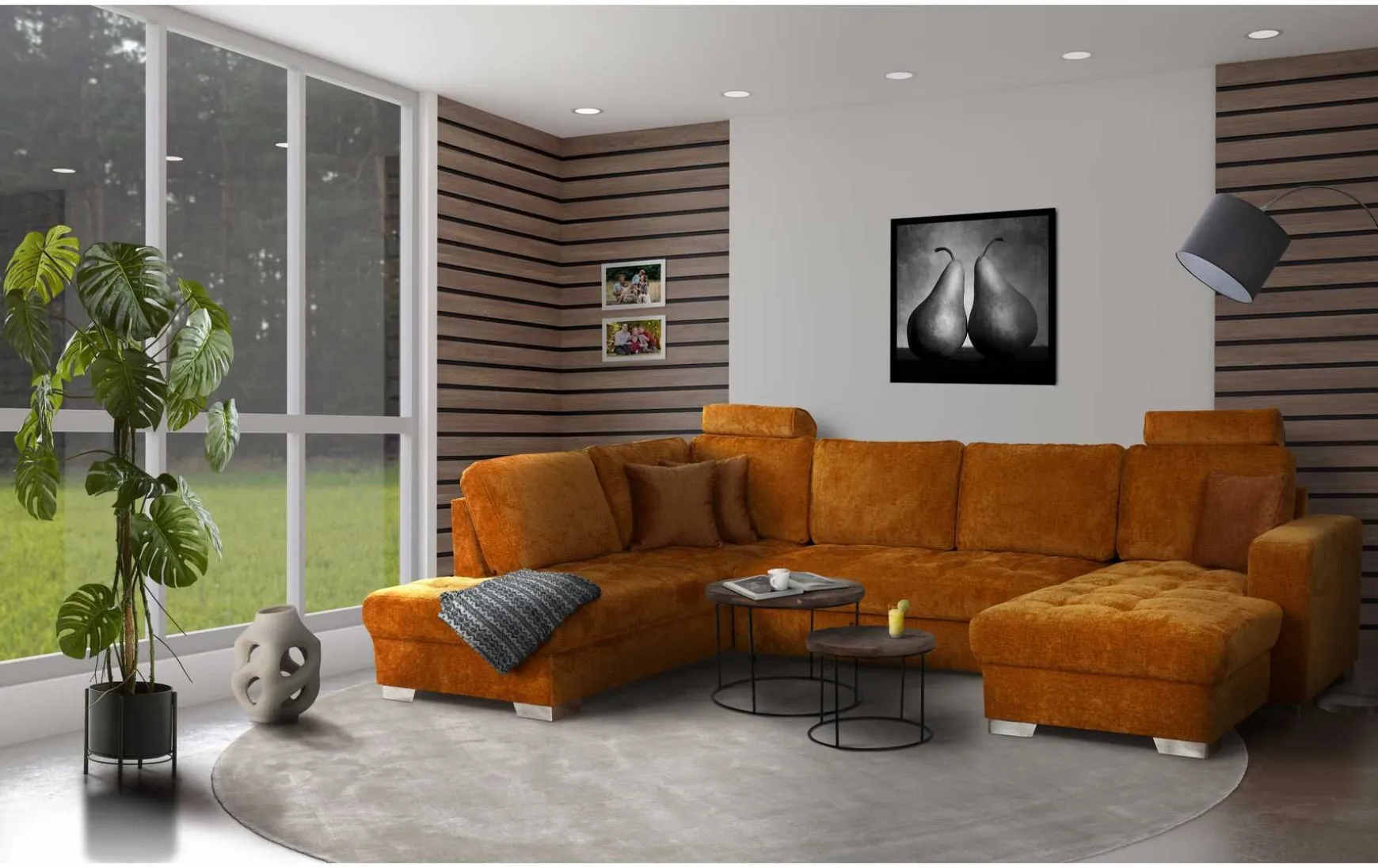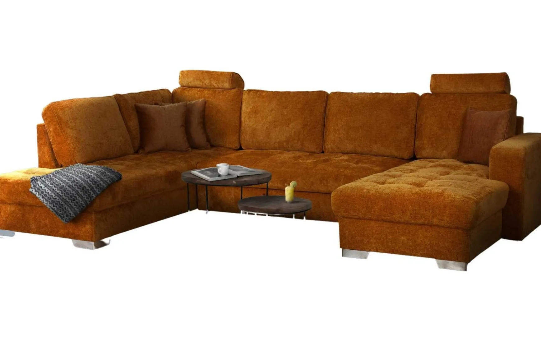Verwandeln Sie Ihr Wohnzimmer in eine Wohlfühloase mit dieser modernen U-förmigen Wohnlandschaft in strahlendem Curry-Orange. Mit großzügigen Maßen von ca. 341 cm Breite, Schenkeln von ca. 215 cm links und ca. 165 cm rechts sowie einer komfortablen Liegefläche von ca. 128 x 265 cm bietet sie reichlich Platz zum Entspannen. Die weichen Polster auf hochwertigem Stoffbezug und die echten Rückenlehnen garantieren erstklassigen Sitzkomfort, während die eleganten chromfarbenen Metallfüße dem Raum einen modernen Touch verleihen. Inklusive dekorativer Zierkissen, optional erweiterbar mit Kopfstützen oder Bettfunktion, lässt sich die Wohnlandschaft individuell an Ihre Bedürfnisse anpassen. Außerdem ist sie in verschiedenen Farbvarianten erhältlich – perfekt für jedes Wohnambiente.