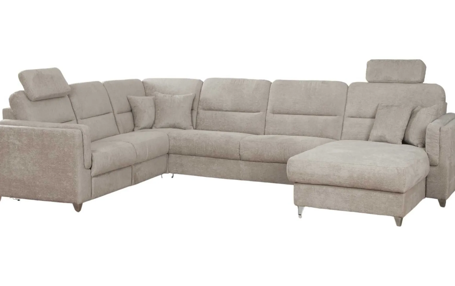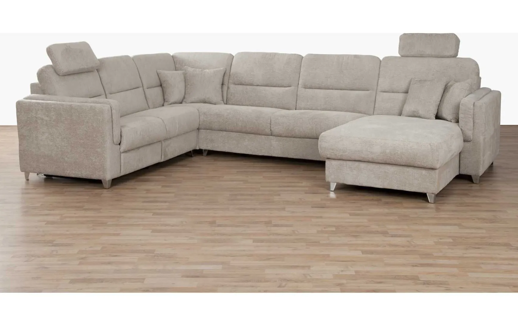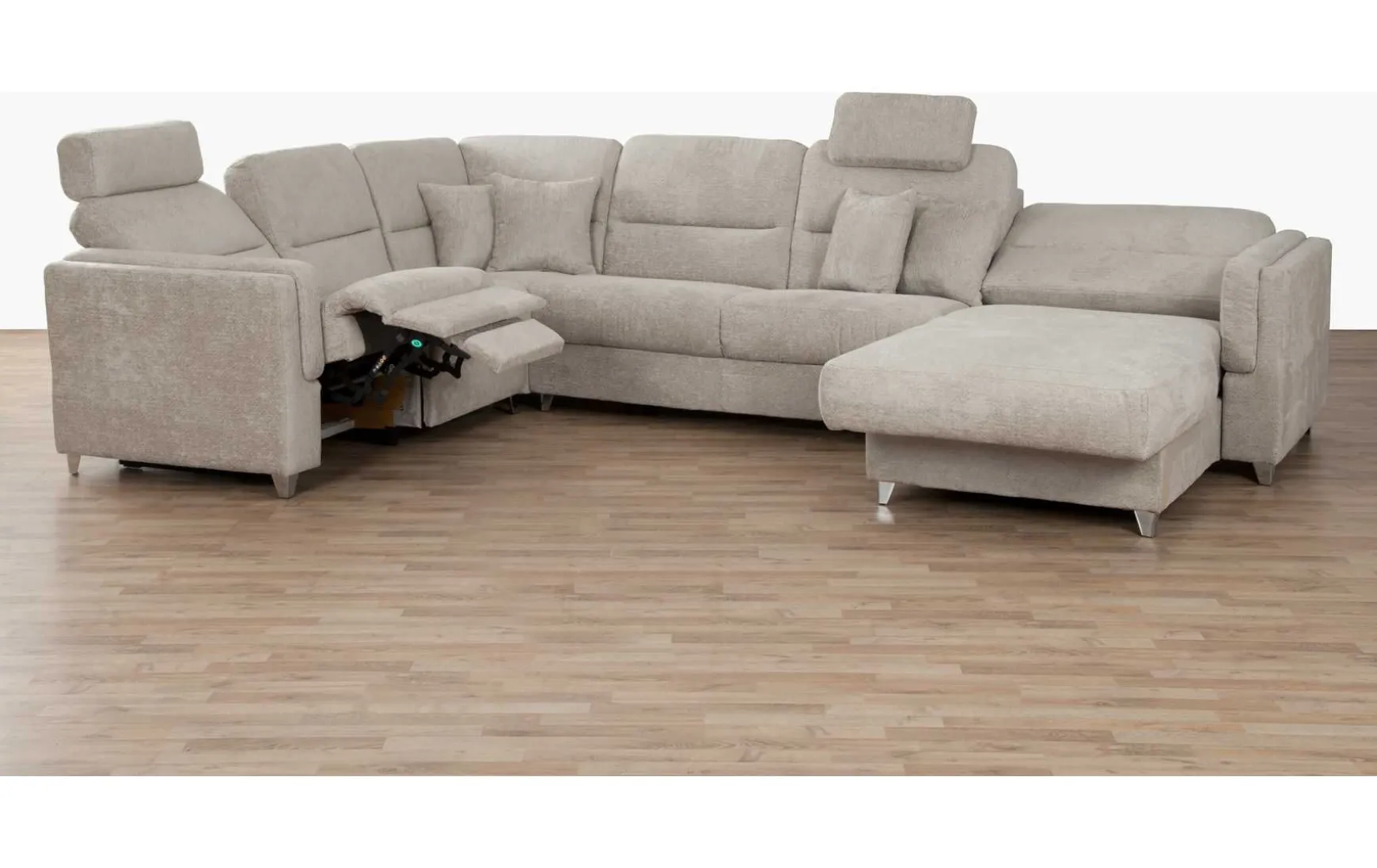 Diese großzügige Wohnlandschaft überzeugt durch hohen Komfort und moderne Eleganz. Der silberfarbene Stoffbezug in Grautönen wirkt zeitlos und lässt sich vielseitig kombinieren, während Metallfüße in Alulook das Design stilvoll abrunden. Dank integrierter Relaxfunktion, vier gemütlicher Zierkissen und rundum echt bezogenem Rücken bietet das Sofa besten Komfort und ist frei im Raum platzierbar. Mit einer Breite von ca. 351 cm und komfortabler Sitzpolsterung aus Komfortschaum auf Nosagfederung lädt die Wohnlandschaft zum Entspannen ein und ist individuell in der Filiale konfigurierbar.