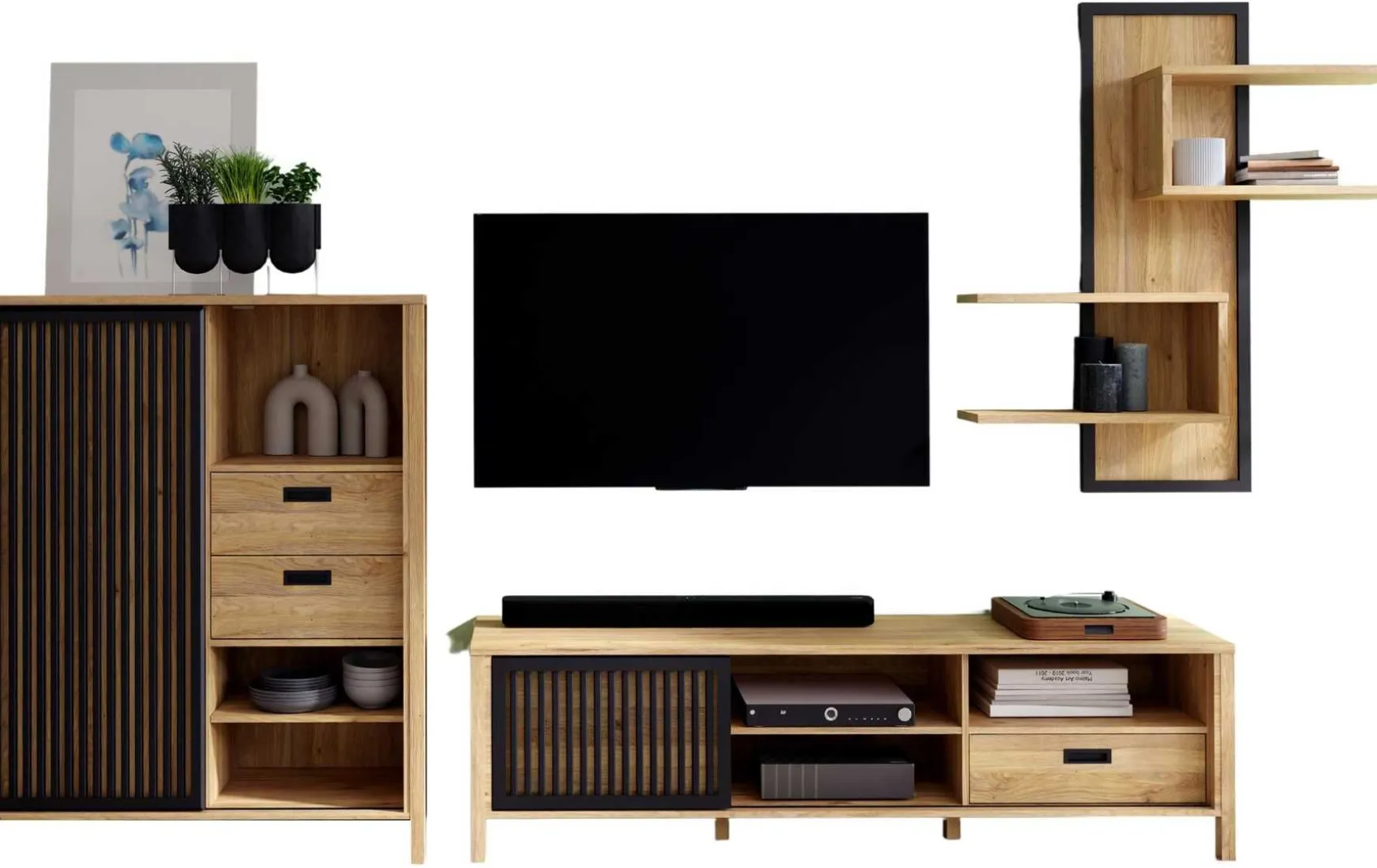 Die interessante Optik sorgt für jede Menge Hingucker, begleitet von ausreichend Stauraum für Bücher und Glaswaren, Schalen, Gläsern oder Geschirr. In die Mitte der Wohnwand stellen Sie Ihr Fernsehgerät sowie weitere elektronische Geräte. Fernbedienungen und Zeitungen finden neben dem Fernseher Platz. Die schwarzen Schiebetüren laufen in schmalen Kunststoffprofilen, die Ihnen ein leichtes Öffnen und Schließen der Türen ermöglichen. Hinter den Lamellen befindet sich eine Platte, sodass Sie Ihre gut verstauten Bücher oder Sammlerstücke nicht verstauben.