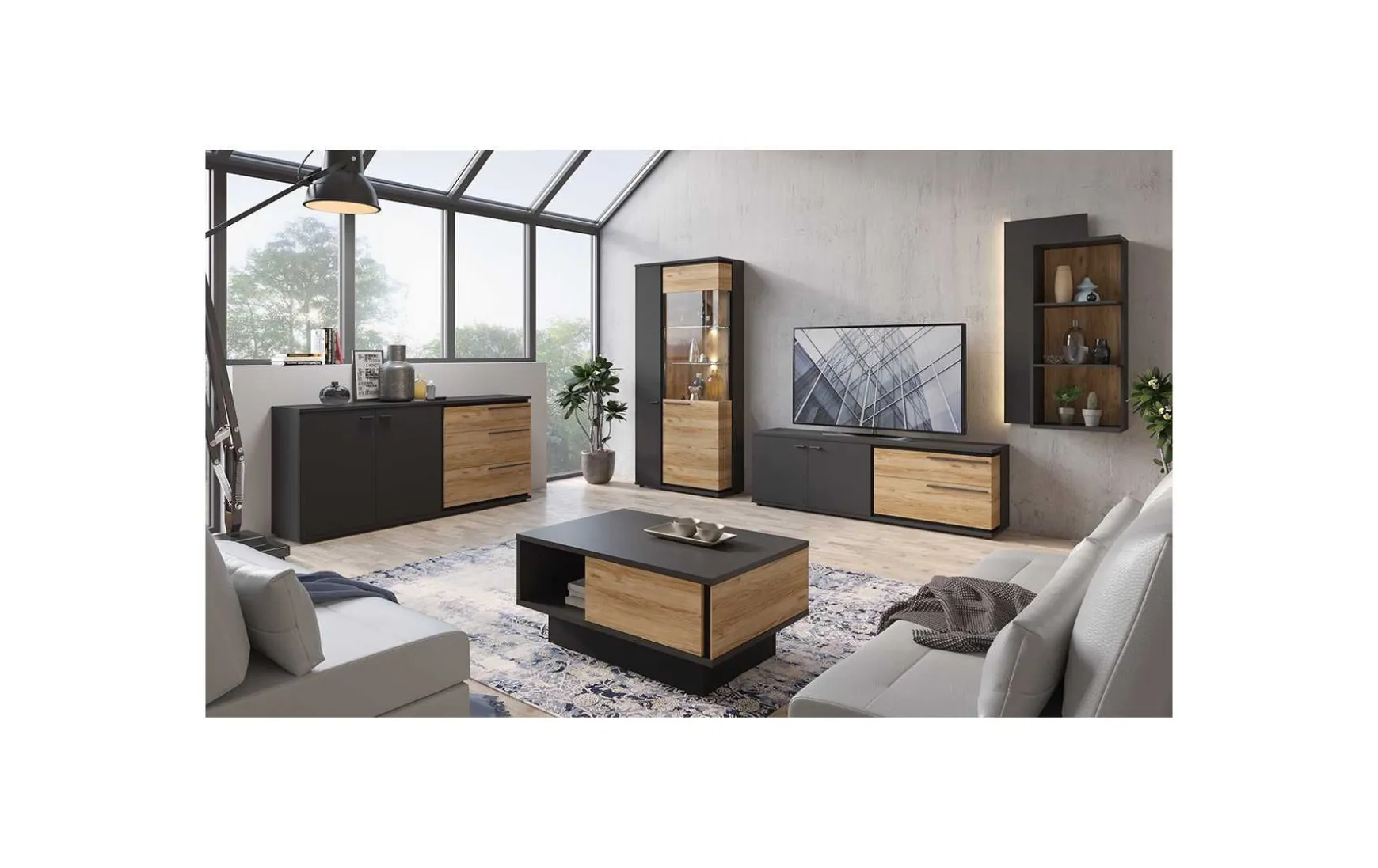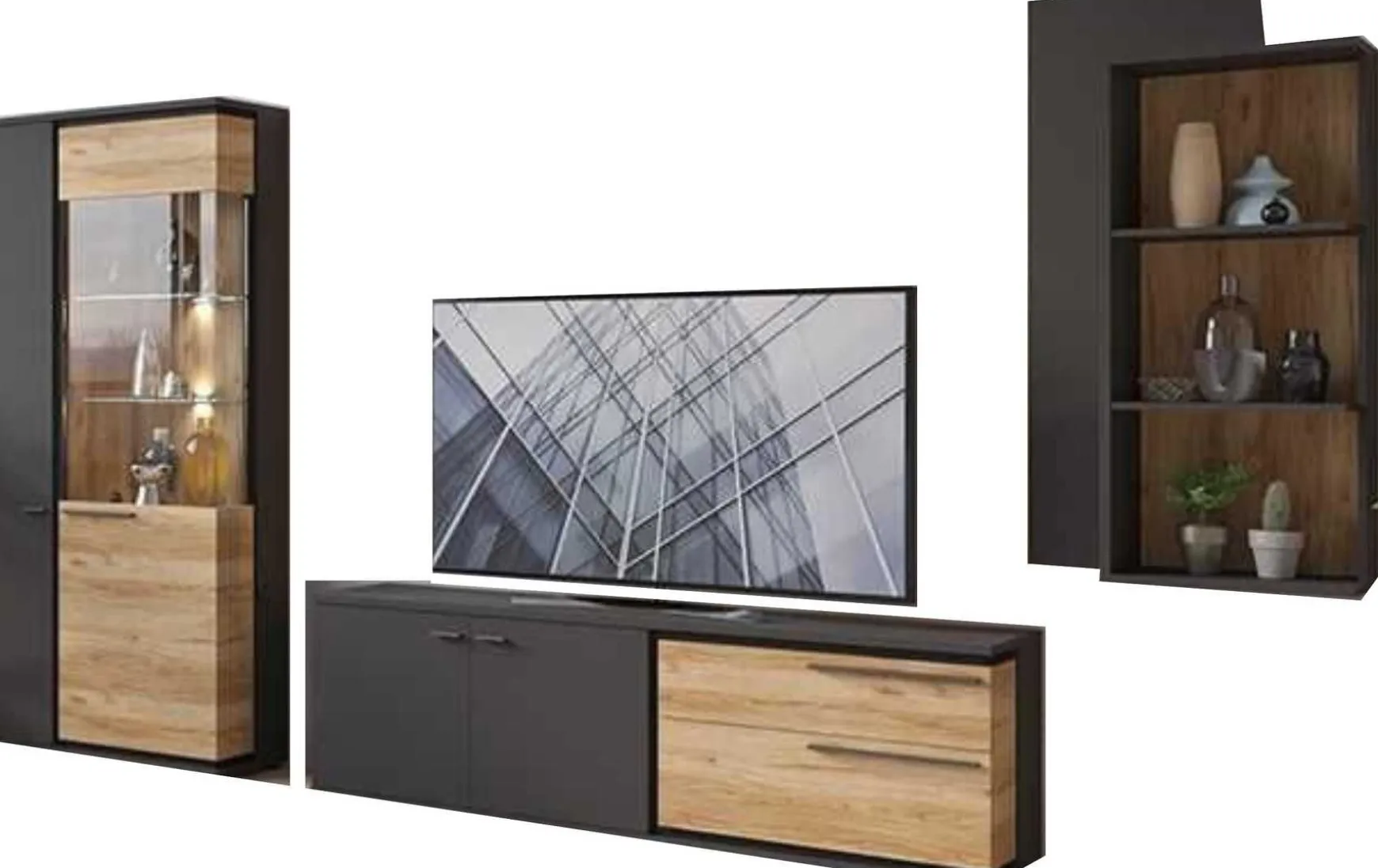 Diese moderne Wohnwand in der stilvollen Farbkombination Kosmos Grau und Catania Eiche überzeugt durch klares Design und durchdachte Funktionalität. Das Set besteht aus Vitrine, Lowboard und Paneel und bietet mit großzügigen Maßen von ca. 292 × 170 × 40 cm (B/H/T) viel Stauraum für Mediengeräte und Wohnaccessoires. Soft-Close-Schubkästen sorgen für komfortables und leises Schließen, während schwarze Griffe moderne Akzente setzen. Eine LED-Beleuchtung sowie passende Beimöbel wie Sideboard oder Couchtisch sind optional gegen Mehrpreis erhältlich.