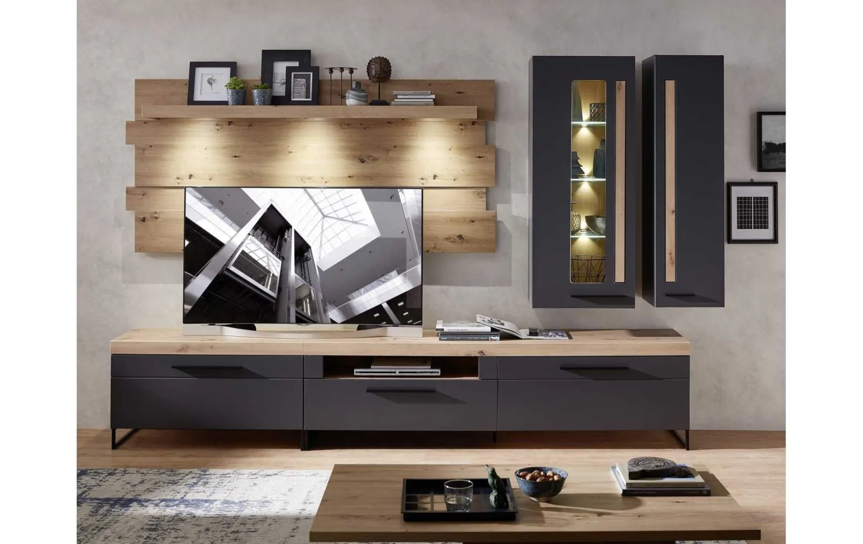Gestaltet in Graphit mit Artisan Eiche Dekor, erhalten Sie eine schöne Wohnwand, die Ihnen jede Menge Stauraum als auch Dekorationsfläche bietet.