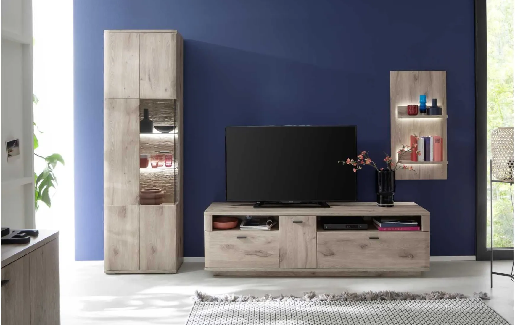 Diese hochwertige Wohnwand im Viking-Oak-Dekor überzeugt durch ihr harmonisches Gesamtbild und viel Stauraum für den modernen Wohnbereich. Die Fronten und der Korpus in Viking Oak Melamin-Nachbildung werden durch eine sichtbare 3D-Rückwand in sandgestrahlter Viking Oak Optik stilvoll ergänzt. Parsolgraues Glas an Front und Seiten sowie Klarglasböden unterstreichen die elegante Ausstrahlung. Das Set besteht aus Vitrine, TV-Unterteil und Wandregal und wird inklusive LED-Beleuchtung mit Funkfernbedienung geliefert – für ein stimmungsvolles Ambiente und eine moderne Präsentation Ihrer Wohnaccessoires.