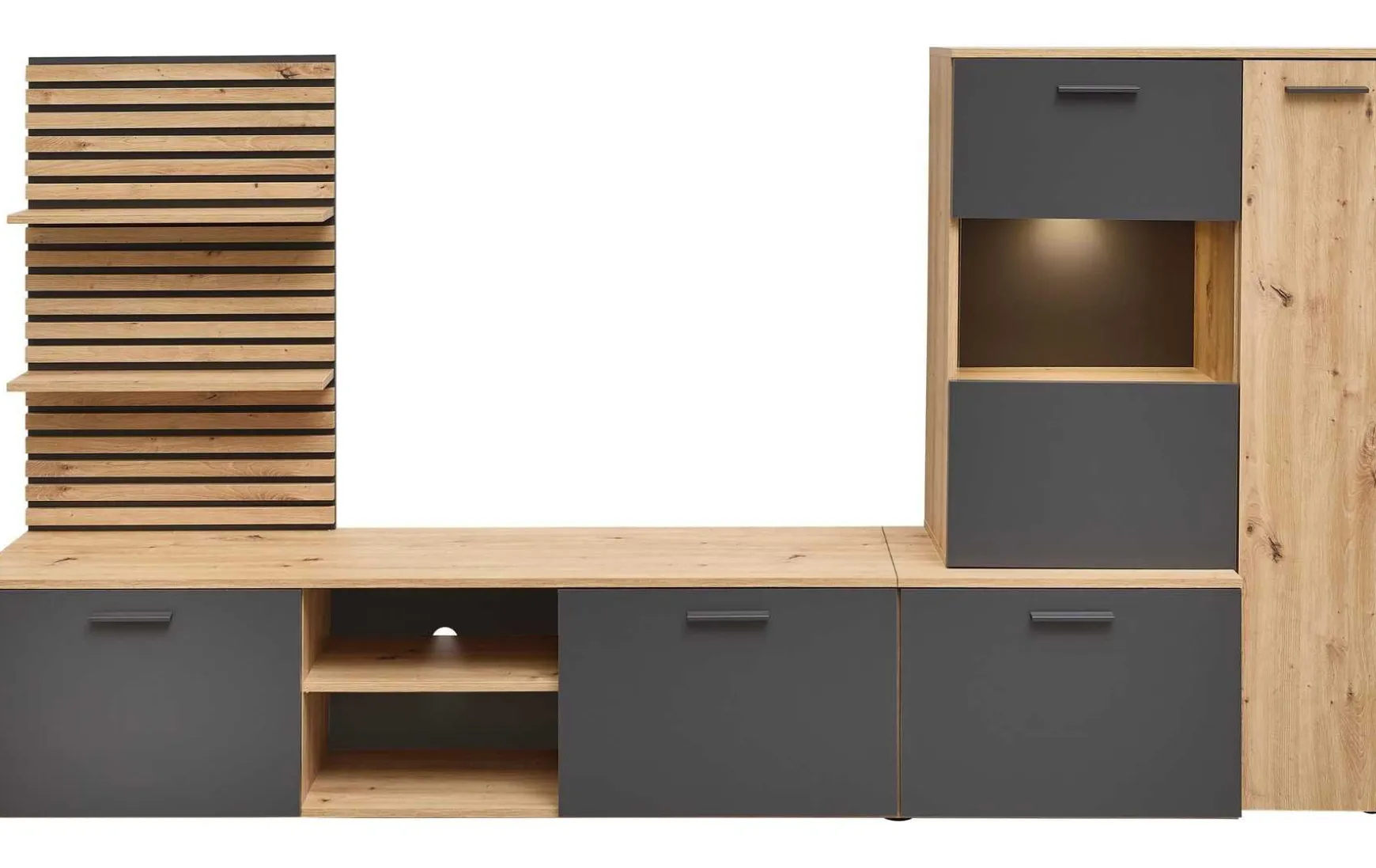 Diese moderne Wohnwand mit integrierter Beleuchtung vereint stilvolles Design mit durchdachter Funktionalität. Das Set besteht aus einer eleganten Vitrine, einem praktischen Wandboard und einem großzügigen Lowboard und bietet damit viel Stauraum für Mediengeräte, Geschirr, Bücher und Dekoration. Die Beleuchtung setzt gezielte Akzente und sorgt für eine wohnliche Atmosphäre. Dank der klaren Linien und der modernen Optik fügt sich die Wohnwand harmonisch in zeitgemäße Wohnkonzepte ein und wird zum Blickfang in Ihrem Wohnzimmer.