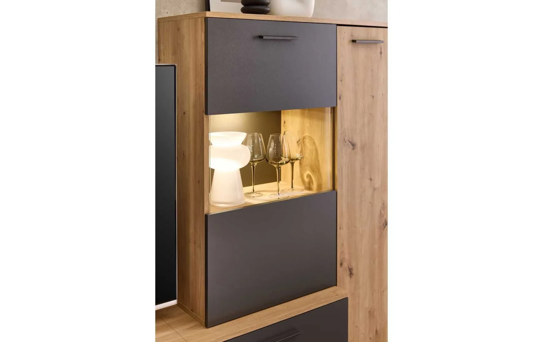 - Viel Stauraum durch Vitrine, Wandboard und Lowboard