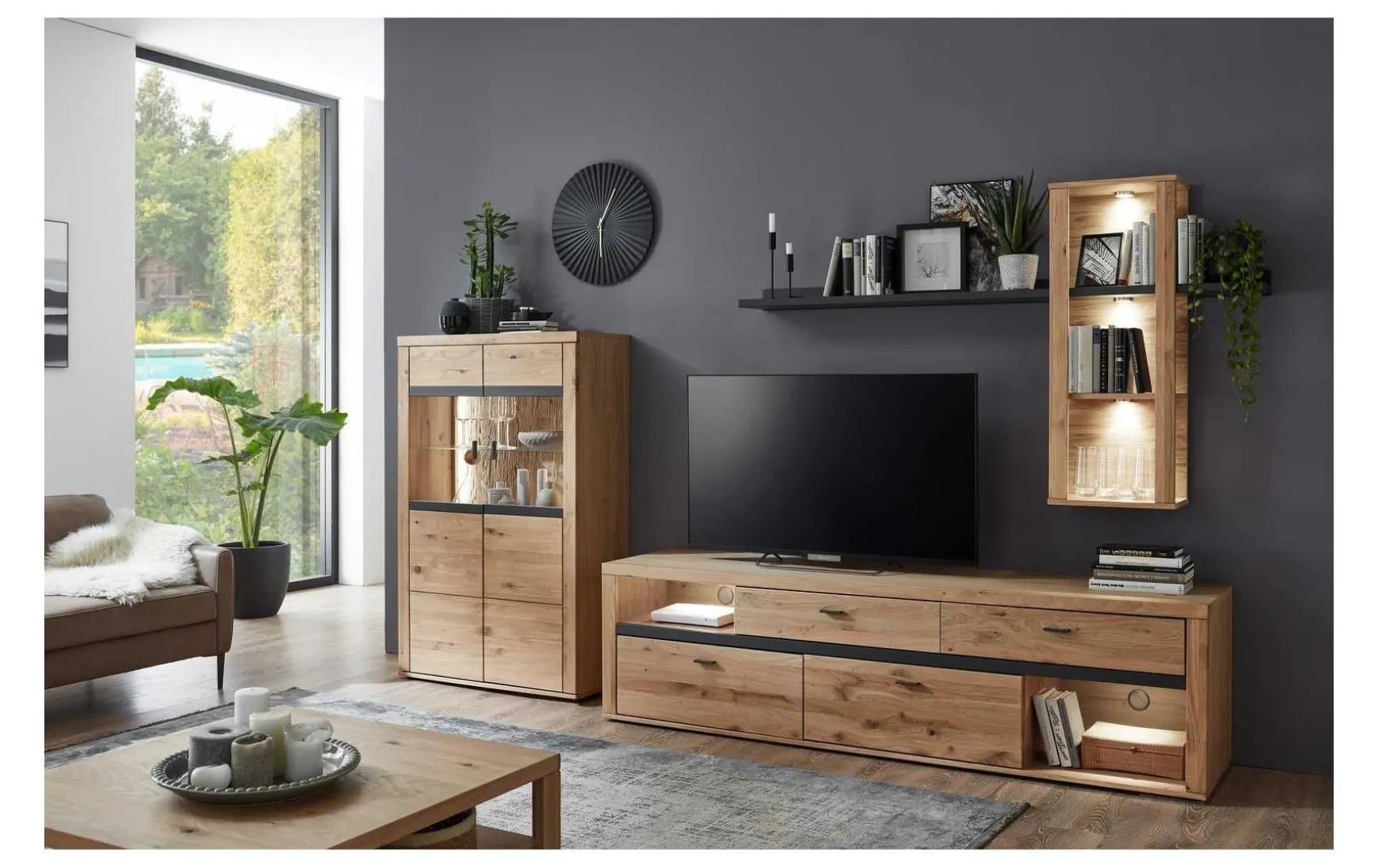 Stivoll werden bei dieser Wohnwand geradliniges Design und modernes Spiel zwischen natürlichen Hölzern, sowie stimmigen Akzenten in grauem Lack vereint.