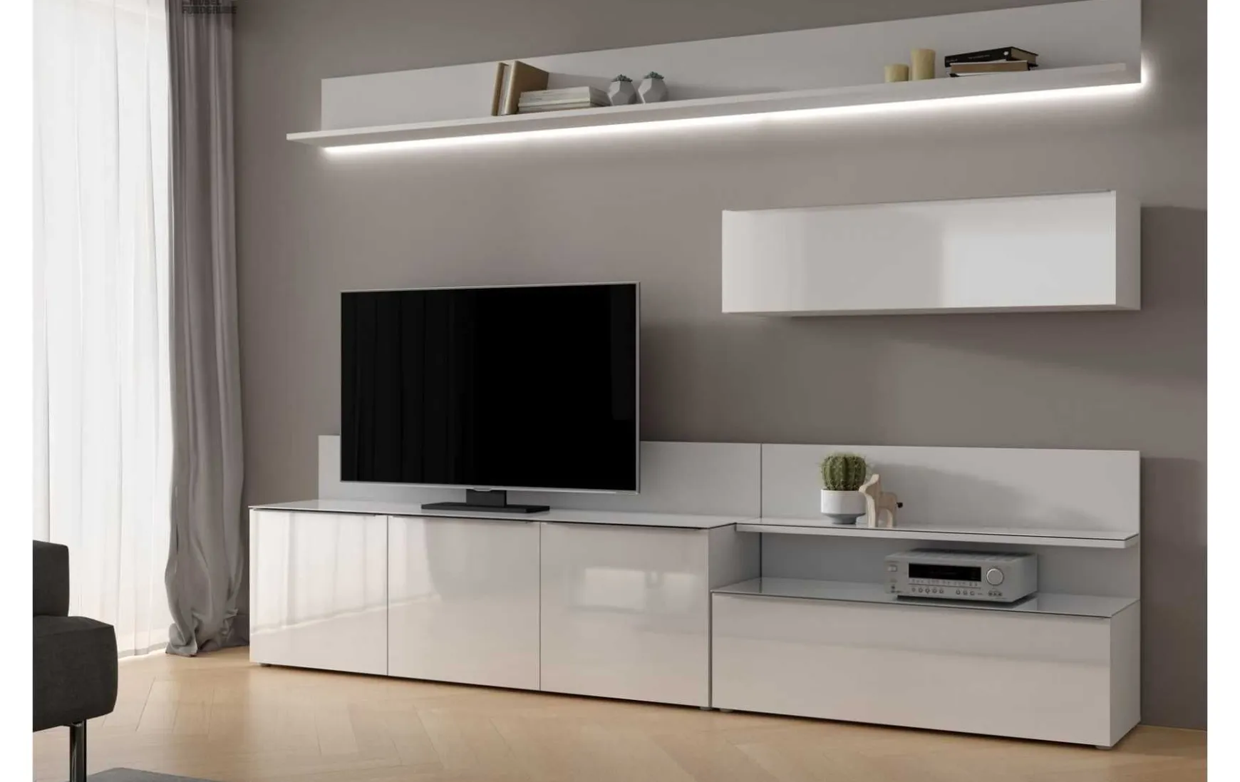 Diese stilsichere und zeitlose Wohnwand in weißer Fronten aus Glas lässt sich mit verschiedenen Einrichtungsstilen kombinieren und die alufarbenen Griffleisten vollenden den modernen Look.