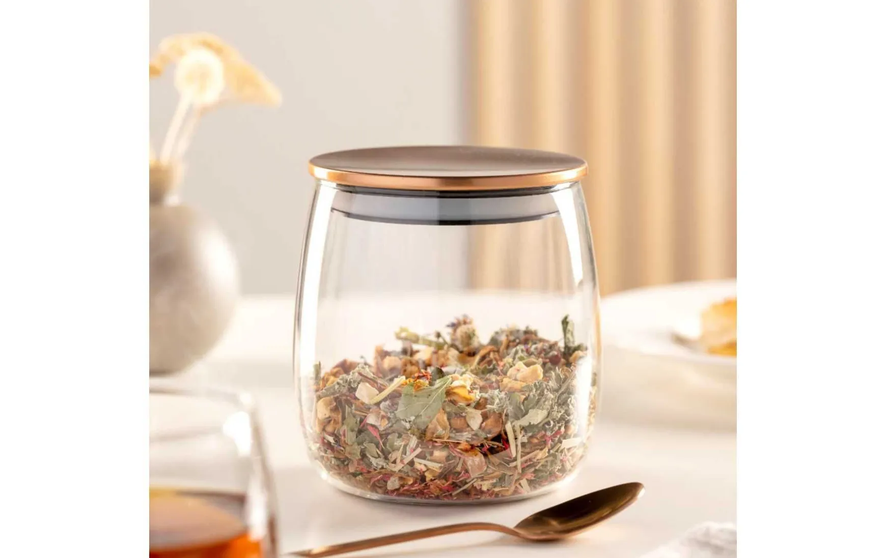 Handgefertigt aus robustem Borosilikat-Glas vereint sie Schönheit und Funktionalität. Das außergewöhnliche Design wird durch hochwertige Materialien und Spülmaschineneignung ergänzt. Perfekt für den täglichen Gebrauch, bewahrt sie Ihren losen Tee frisch und stilvoll. Entdecken Sie Teeaufbewahrung neu!